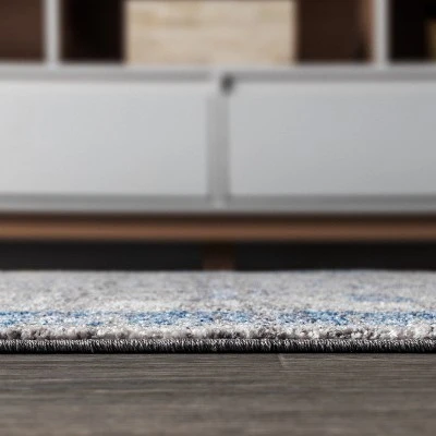 Based on a vintage medallion rug design, Anatolia mixes peacock blue and shades of gray for a modern color palette. A central medallion in peacock blue sits on a mingled gray background. An ornate border in peacock blue accented with mustard yellow completes the design. Varying shades of color create a worn, vintage look.