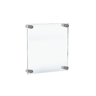 These classy one-sided Wall Mount Floating Frames are ideal for displaying artwork, photos, posters or branding in your office, home or at an event. These clear double panel floating frames with silver caps are strong, stable, as well as easy to clean and maintain. The innovative design holds your artwork or picture in place without it moving or slipping at all. Add elegance to your professional environment with Azar’s clear acrylic gallery frames with silver satin aluminum caps and standoffs. Frames can be used vertically or horizontally. Each floating sign holder frame set includes 2 acrylic panels that are 3/16 thick, 4 silver standoff caps and hanging hardware. Note: Large format sizes: 24 x 36 and 30 x 40 include 6 standoffs and caps. Easy to change the sign or photo, simply unscrew the front silver cap and switch out the graphic. There is no need to remove the frame from the wall once it is affixed. The edges are flame polished giving these floating picture holders a high end finish with a touch of fancy. Hang these beautiful acrylic frames in boutiques, museums, trade shows, hotel lobbies, restaurants, retail stores, schools, at work or at home. Sold in Multiples of 1. Sold in Multiples of: 1 Material: Acrylic (3/16 thick) Frame Orientation: Portrait/Landscape Poster Measurement: 9 x 12 Overall Frame Measurement: 13 x 16 Includes:Four 1 SILVER diameter aluminum standoffs and caps, and four all purpose screws with anchors. (Gold Cap Hardware can be purchased as an add-on item.) Color: Clear