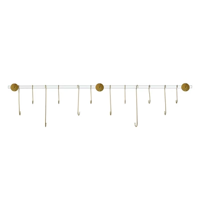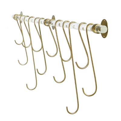 - This wall hanger is composed out of a clear acrylic rod and 12 brass metal finished hooks.