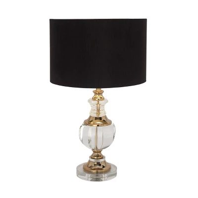A glam style decorating scheme requires light fixtures that are anything but ordinary. An impressive 24” in height, this table lamp brings light and beauty to any corner of your room. Its clear body is constructed of elegantly curved crystal with gold colored iron accents. A black drum shade sits atop the lamp, adding a sense of balance and dimension. The interior of the shade is a gorgeous gold color. Uses one standard E26 light bulb (not included). This item has a 62” cord length. Suitable for indoor use only. A drum shaped shade made of fabric. Desk light has an easy on/off twist switch under the shade. This item comes shipped in one carton.