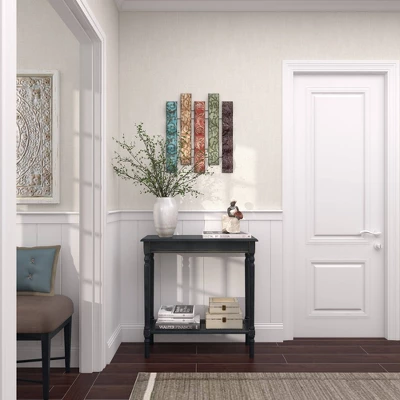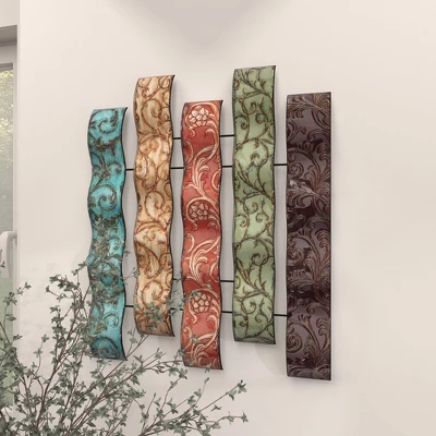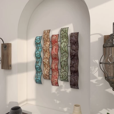 The colorful yet muted tones coupled with the embossed designs add loads of texture and pops of color, so display as a centerpiece to tie your space together. This item ships in 1 carton. Can be hung vertically using the keyholes on the back; nails and screws not included. Suitable for indoor use only. This item ships fully assembled in one piece. This is a single multi colored wall sculptures. Traditional style.