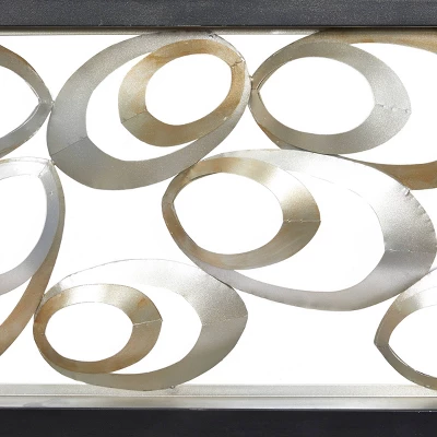 Hang a glamorous and extravagant piece of abstract-styled iron wall art into your modern, glam, and contemporary living home styles by adding this ‘Dancing Ovals’ iron wall art into your chic and elegant homes! Intricately crafted to perfection, this ‘Dancing Ovals’ wall sculpture showcases an abstract-style collection of light and dark gold-finished ovals with thickened ends made of solid iron material and a thick rectangular ‘open design’ frame in matte black finish. This decor’s light abstract design make them a great focal point piece for any modern-styled homes, luxury hotels, spas, and condominiums. Easy-to-hang round metal feature (nail or screw). Suitable for indoor use only. This item comes shipped in one carton.
