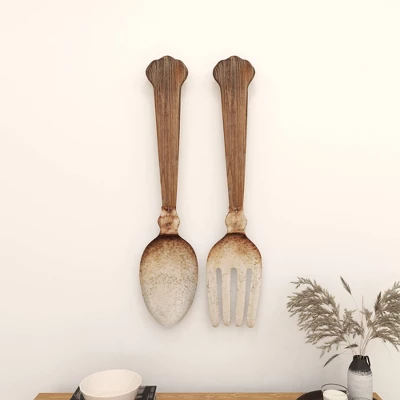 These utensil decors will look excellent in any farmhouse style inspired dining rooms or kitchens. This item ships in 1 carton. Extra large metal and wood flatware wall decor pieces. Iron wall decor makes a great gift for any occasion. Can be hung vertically using the keyholes on the back; nails and screws not included. Suitable for indoor use only. This item ships fully assembled in one piece. This brown colored wall sculptures comes as a set of 2. Farmhouse style.