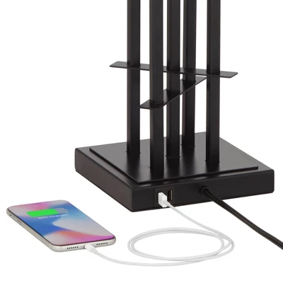 Possini Euro Design Deborah Modern Mid Century Table Lamp 30″ Tall Black With USB Charging Port Gold Metal Double Drum Shades For Living Room Desk